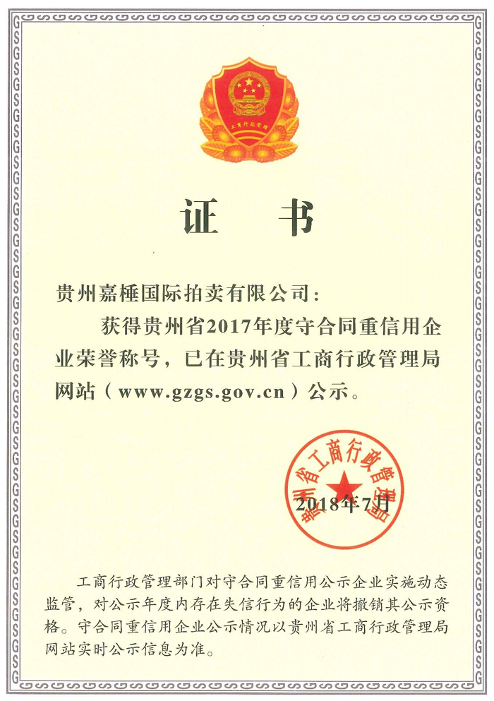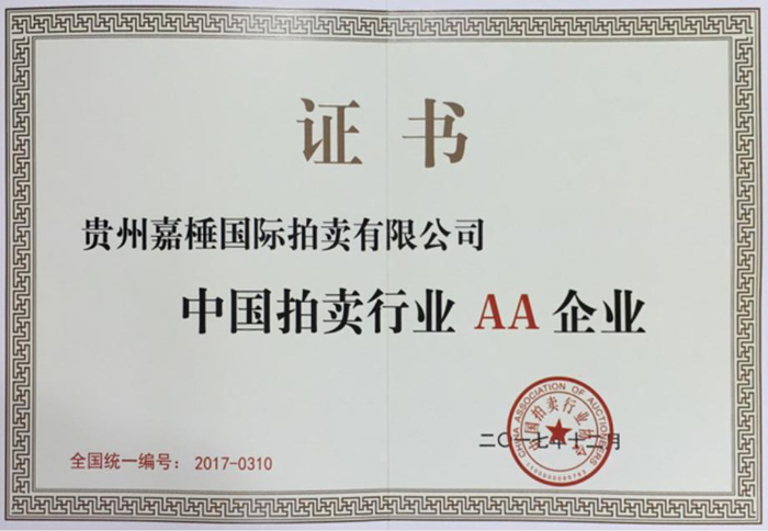 貴州嘉棰國際拍賣有限公司是主要從事動產、不動產、無形資產和文物藝術品拍賣業務的大型綜合性拍賣企業,是中國拍賣行業協會會員,貴州省拍賣行業協會理事單位,中國拍賣行業協會AA級資質企業,貴州省連續十一年重合同守信用企業,全省拍賣先進企業,貴州省公物拍賣人。公司充分利用多年來積累的客戶資源和全新的經營理念服務于貴州經濟發展。同時也為貴州省國有企業的資產重組、改制改造以及不良資產的變現,起到積極的作用。貴州嘉棰國際拍賣有限公司自成立以來,多次成功地組織了房產、土地、機器設備和各種物資等標的拍賣。并于2001年12月成為第一批貴州省高級人民法院及多家金融機構指定的拍賣企業。 公司下設產權部、市場發展部、財務部、人事部和辦公室。現有員工11名,大專以上學歷員工占總數的90%,擁有精通業務的專門人才。有國家注冊拍賣師3名,公司工作人員大多參加過中國拍賣行業協會組織的從業資格培訓。公司堅持“客戶至上,執業嚴謹,公平競.....